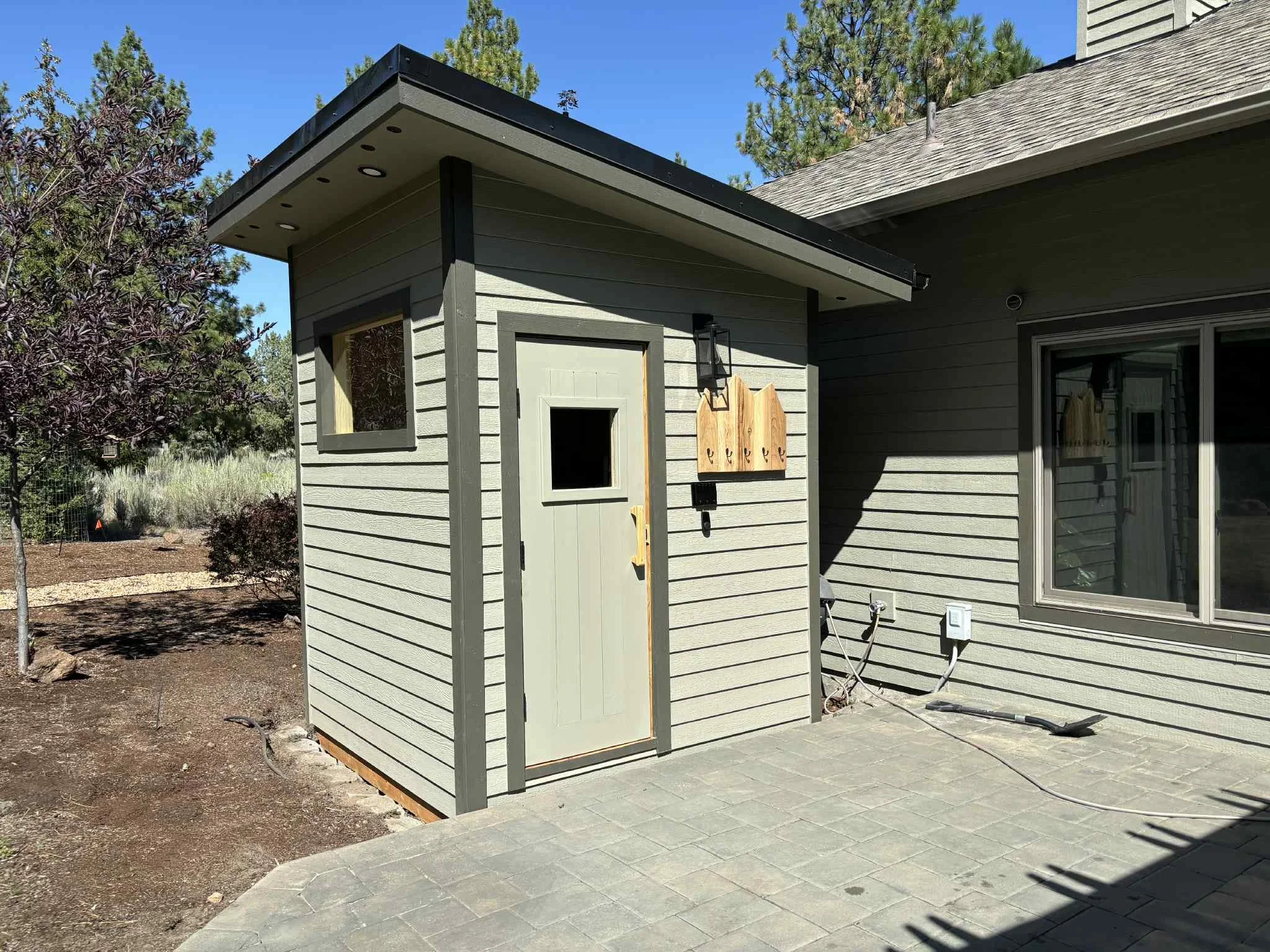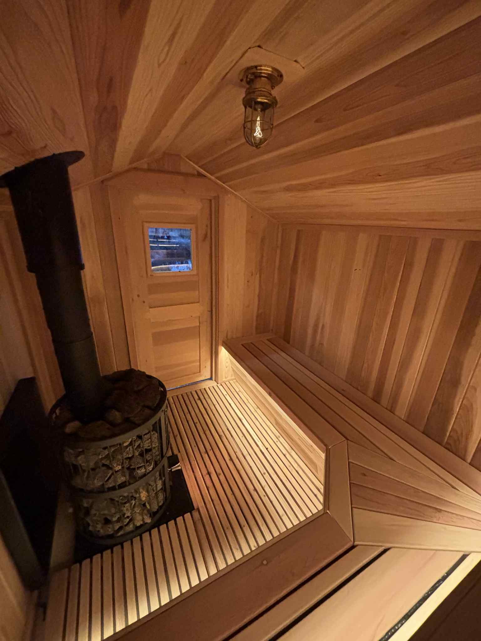 And ended as a beautiful, modern rustic custom sauna that our clients Erin and Lisa will use to host their hip campers! This sauna used beautiful clear grade Japanese cedar and clear grade locally harvested and milled incense cedar (shoutout Levi Sawmill in La Pine, OR) for the benches. We installed a beautiful Harvia Legend 240 wood burning sauna stove to serve as the “soul” of the sauna. We love the salvaged nautical light to complete the look of the room. The floor employs the “Auerbach" method” of a sloped drain, with duck boarding over the thin layer of concrete.
